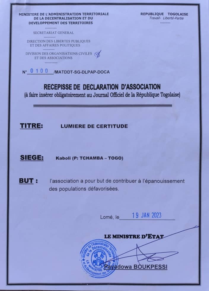 علما بأن جمعية البر للرفاهية مع جمعية نور اليقين في شمال توغو هي إحدى جمعيا من الجمعيات المعروفة لدا لحكومة توغو،وأنها تقوم بنشاطات عديدةفي شمال دولة توغو،ومن ذلك قافلة الدعوية في قرى والأرياف ،حفر الآبار،و بناء المساجد،و توزيع الإفطارات،ولحوم الأضاحي ،على محتاجين،من المسلمين